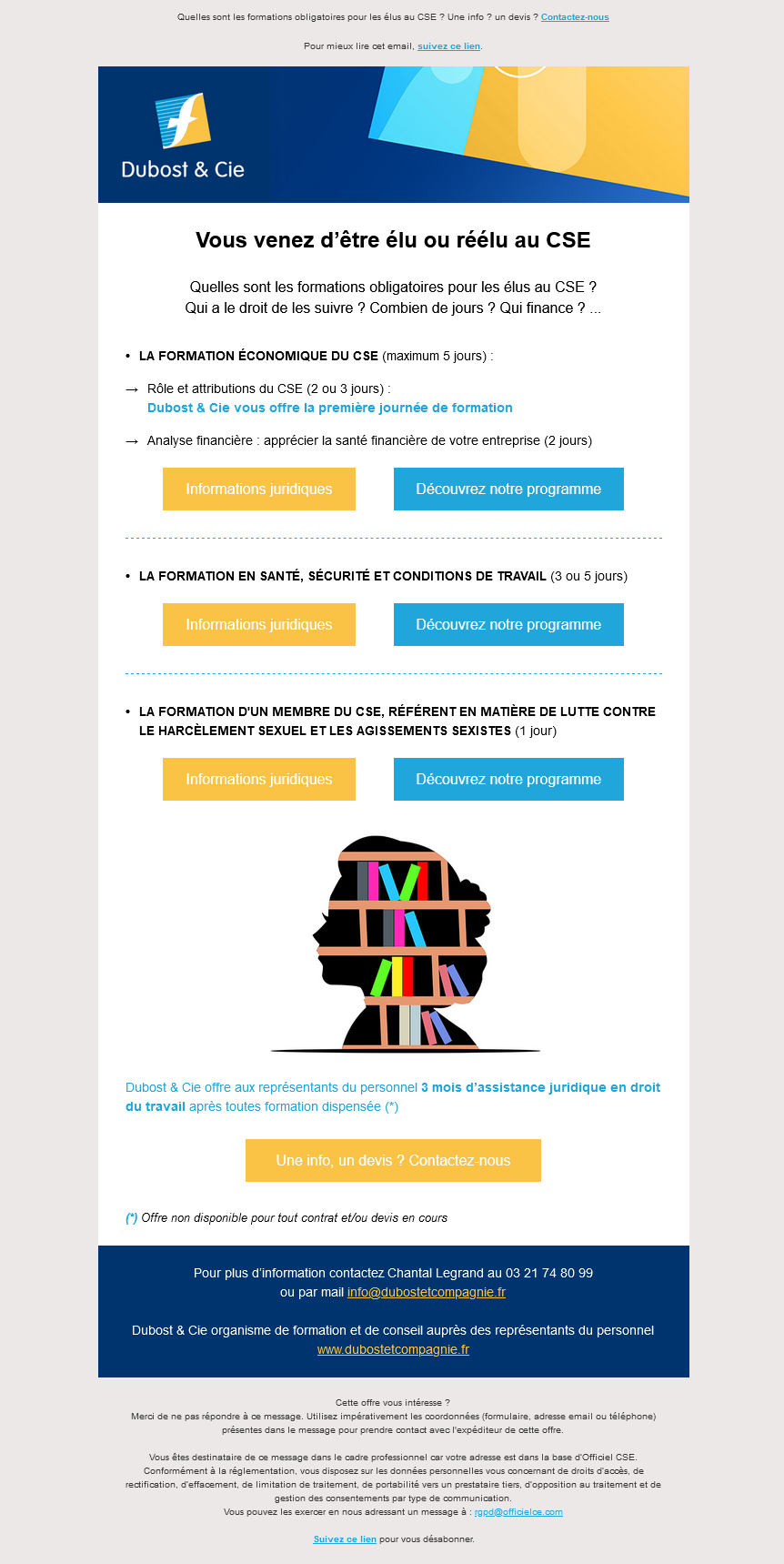 Dubost & Cie 0 Dubost & Cie Objet : Tout savoir sur La formation des élus du CSE Cible : Comités sociaux et économiques – CSE Notre prestation : Conseil et accompagnement : 100% Opimisation du visuel : 100% Test de délivrabilité : 100% Ciblage et routage : 100% Tracking et analyse : 100% 28 septembre 2023 Nos clientsNos clients CSE & Groupes Projets liés Editions Lamy – Groupe Liaisons Zoo de la Flèche ProwebCE King Jouet