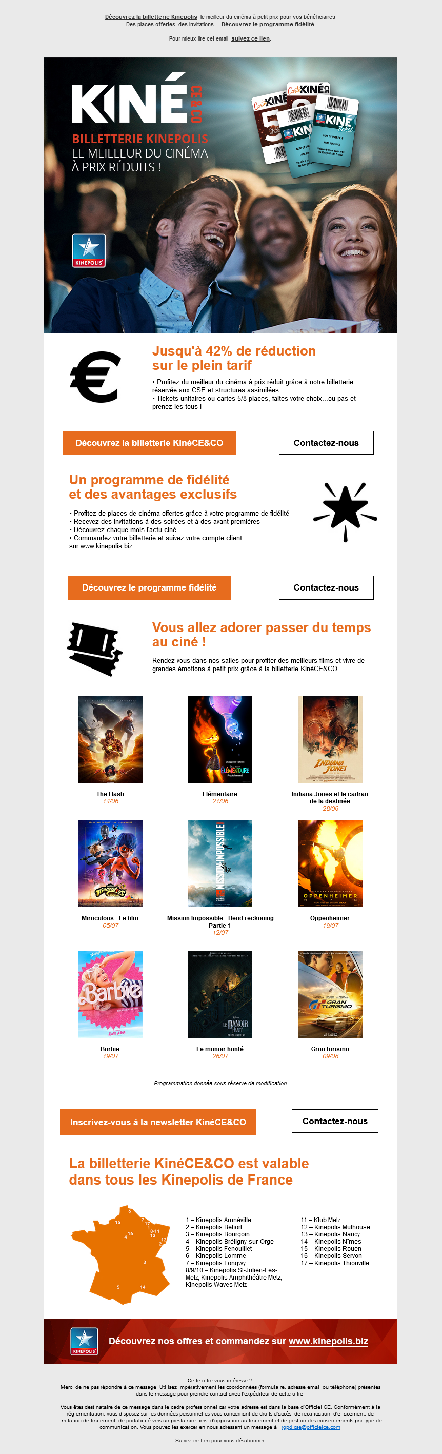 Kinepolis 0 Kinepolis Objet : Profitez du meilleur du cinéma à prix réduit Cible : Comités sociaux et économiques – CSE Notre prestation : Conseil et accompagnement : 100% Opimisation du visuel : 100% Test de délivrabilité : 100% Ciblage et routage : 100% Tracking et analyse : 100% 28 septembre 2023 Nos clientsNos clients CSE & Groupes Projets liés Editions Lamy – Groupe Liaisons Zoo de la Flèche ProwebCE King Jouet